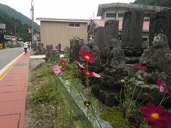 コスモスの花が咲く石仏を横目に、民俗資料館へ急ぐおねえちゃんだった。 最後の問題の答えを解いて、さぁ応募! あとは住所と名前、やってみての感想を書いて終わりなのだが…感想文が大のニガテのおねえちゃん、10分程苦悩した末に、やっと書き上げて観光案内所のお姉さんに応募用紙を渡す事が出来ました。