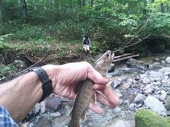 キャンプ場から黙々と山道を登り、目的の沢に到着するや、コースケが「う○こがしたい!」と言い出した。ちょうどティッシュがあったので、コースケ初野○ソ。コースケがふんばっている隙に、毛鉤をひと振り…と、いきなり釣れました~。 こりゃ幸先が良いと思っていましたが、その後が全く反応なし! 暗くなって来たので戻って、テント下の流れで、もう一匹追加♪今年は中々渋い釣りの七入となっています。