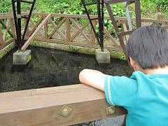 檜枝岐の舞台に向かって、メインストリートを歩いていくと、火の見櫓の下に木のフェンスで囲った池がある。前々から気になっていたのだが、中を覗いてみると、無数の岩魚・ヤマメが群泳しているではないか!毛鉤をポトリと落とせば…と、思ったが、しっかりと監視カメラ付き。 コースケ、おびただしい数の渓魚に釘付け。