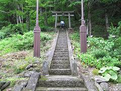 檜枝岐の舞台の帰り道、一つ目の道端に謎解きクイズの答え発見! そしてもう一つの答えのある愛宕神社の急な階段をおねえちゃんが駆け上がって行きます。 おねえちゃんの答えが怪しいので、付いて行きたかったのですが、急な階段だったので下からデジカメのズームでパチリ。