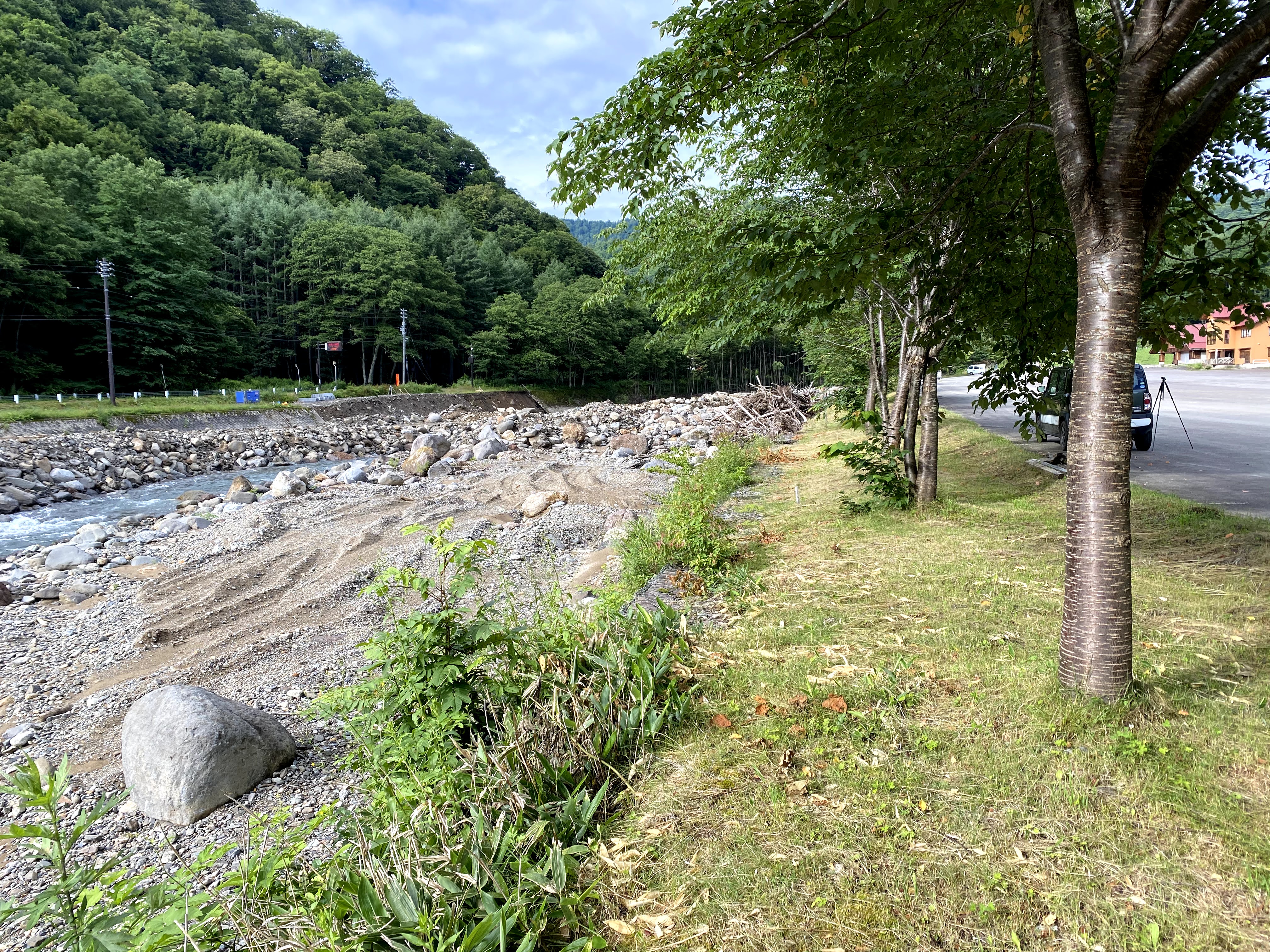 今日は雨もやみ、雲のすきまから青空が見えるまずまずの天気となりました。 普通の釣り人であれば、空が白み始める4時頃から朝マヅメを狙いますが、テンカラは早朝はあまり良くない?(個人的な見解です)ので、ゆっくりと支度。 今日は七入で釣りをすることにし、七入駐車場へと向かった。 去年の秋の台風の影響はどれ位あるのか気になっていましたが、あら大変! 七入駐車場下流の堰堤~七入オートキャンプ場横まで、河川改修工事中ではありませんか… 河川に重機が入って、川の流れは雨どいのごとく…これでは放流魚が居付ける場所もありません。