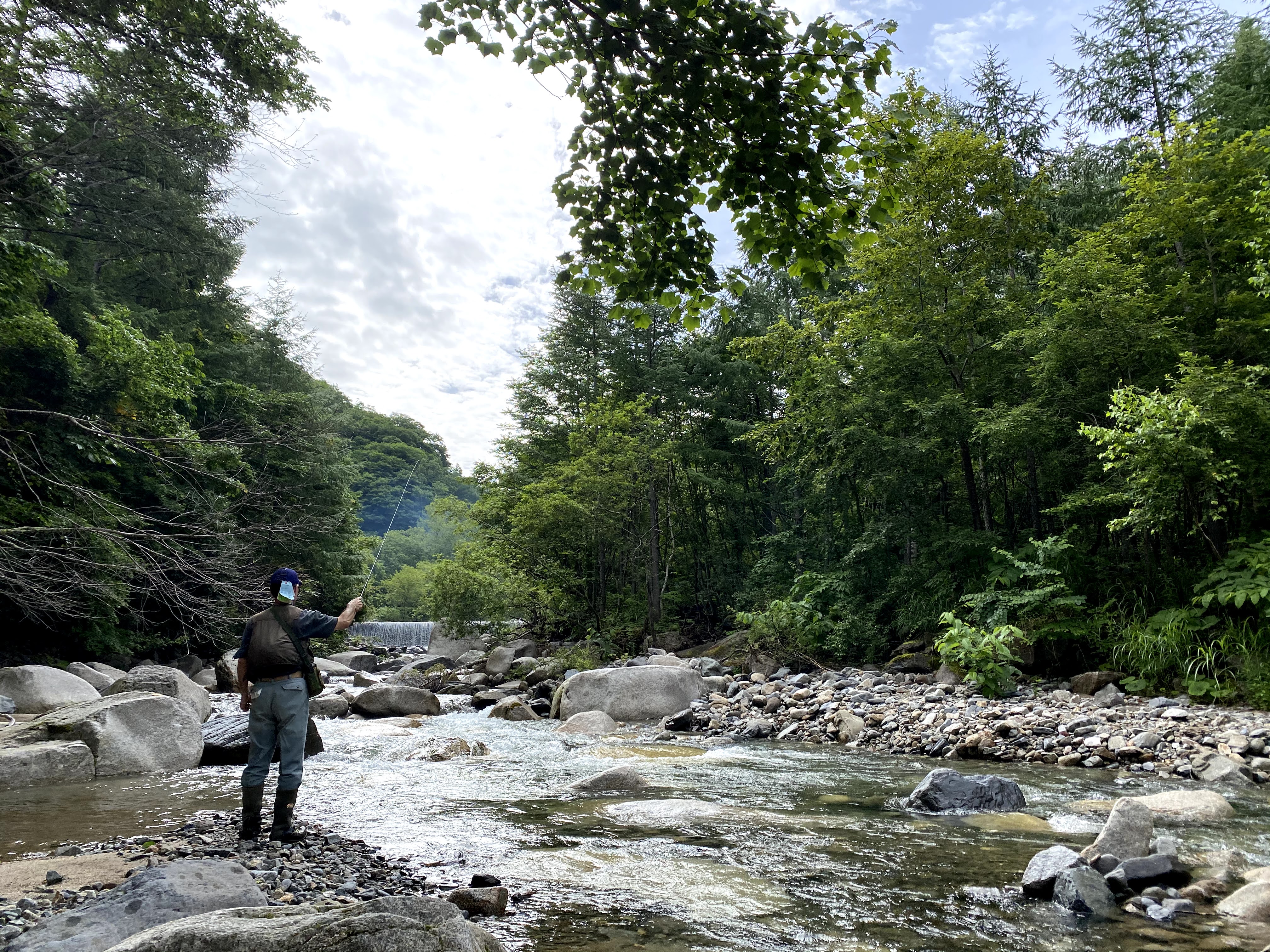 舟岐川は太い流れの場所が多く、毛鉤を打ち込むポイントがピンポイントになるため、コースケはなかなか釣りができません。さらに頭上のブッシュも多いので一苦労しています。