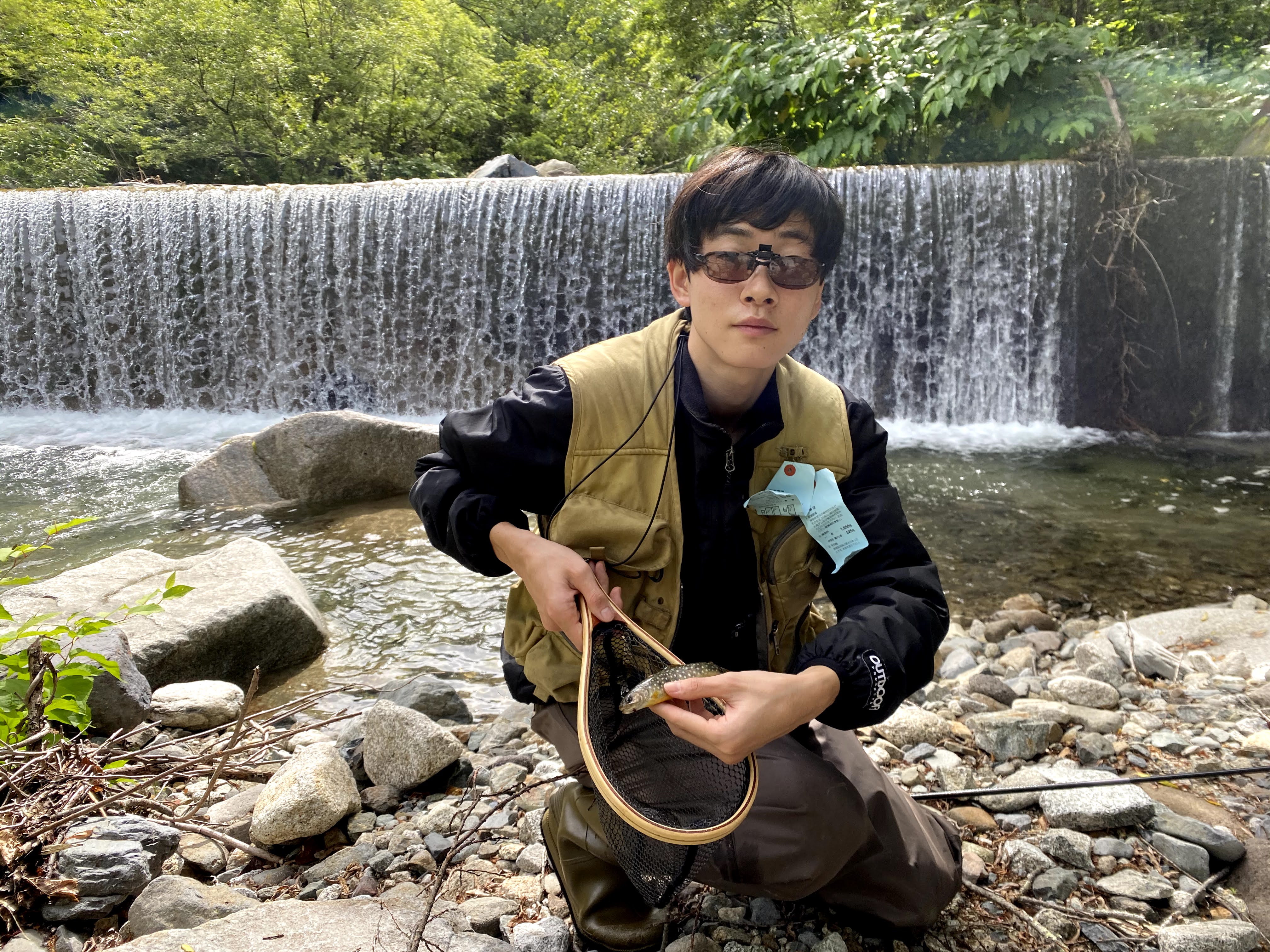 コースケがパラシュートで狙ってみるも、底の流れの筋から上がってくることはなく、毛鉤を完全無視。