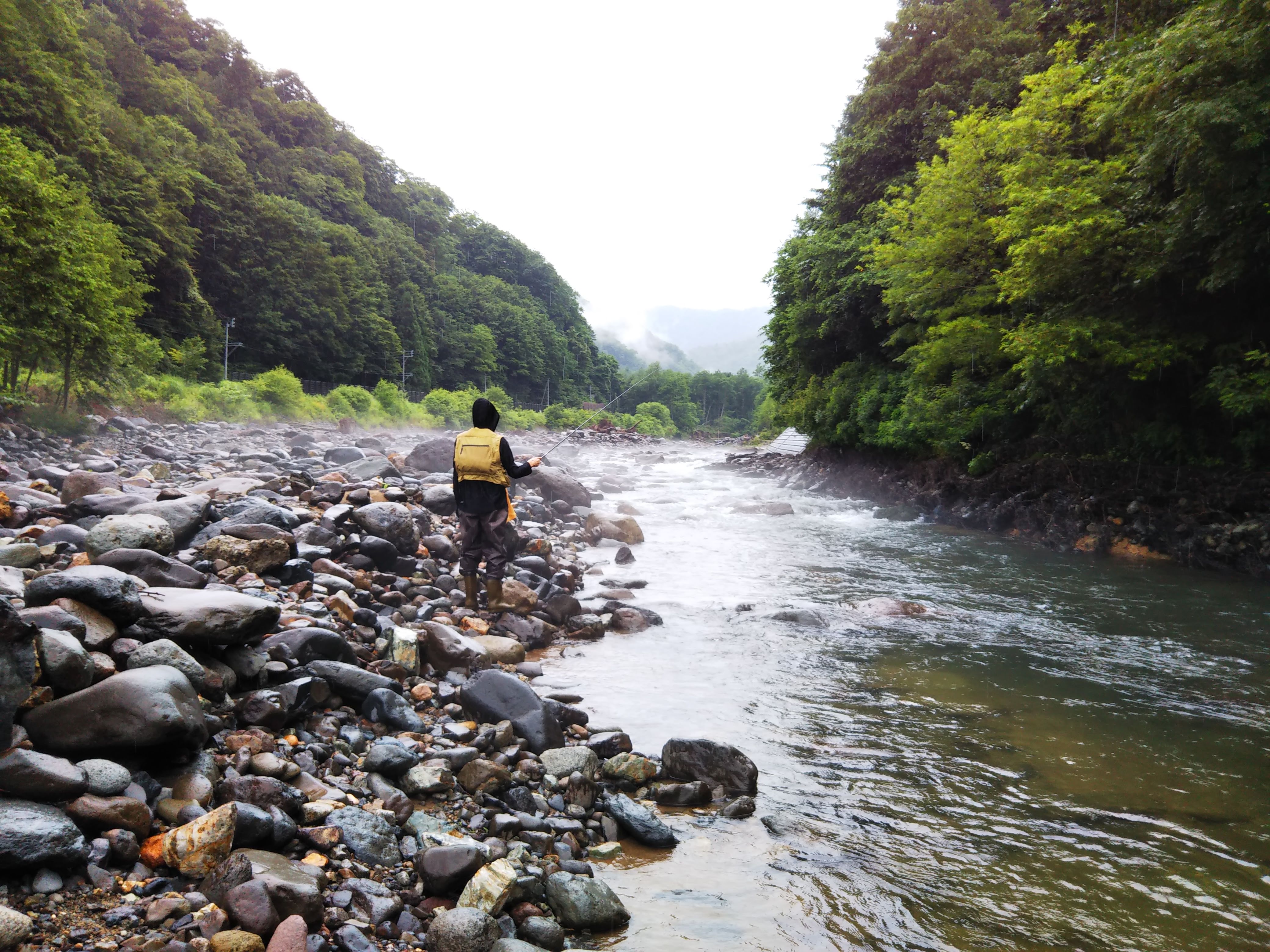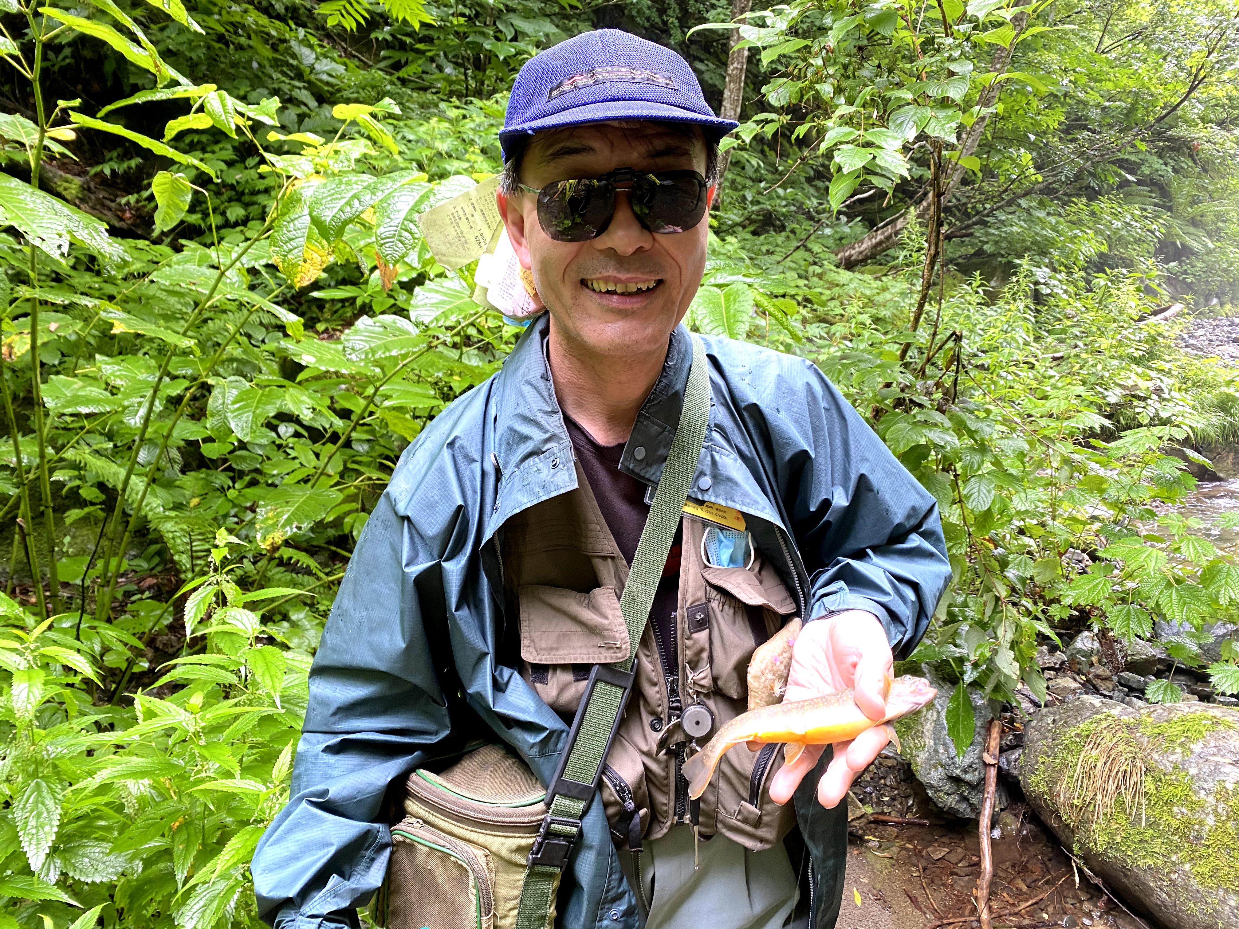 雨の降る渓は、霧が漂って空気が冷んやりしていて気持ちいい。支流はブッシュが多いので、コースケは見学。3mの竿に短いラインをセットするも、ブッシュに毛鉤を引っ掛けて苦戦しながら進んでいく。