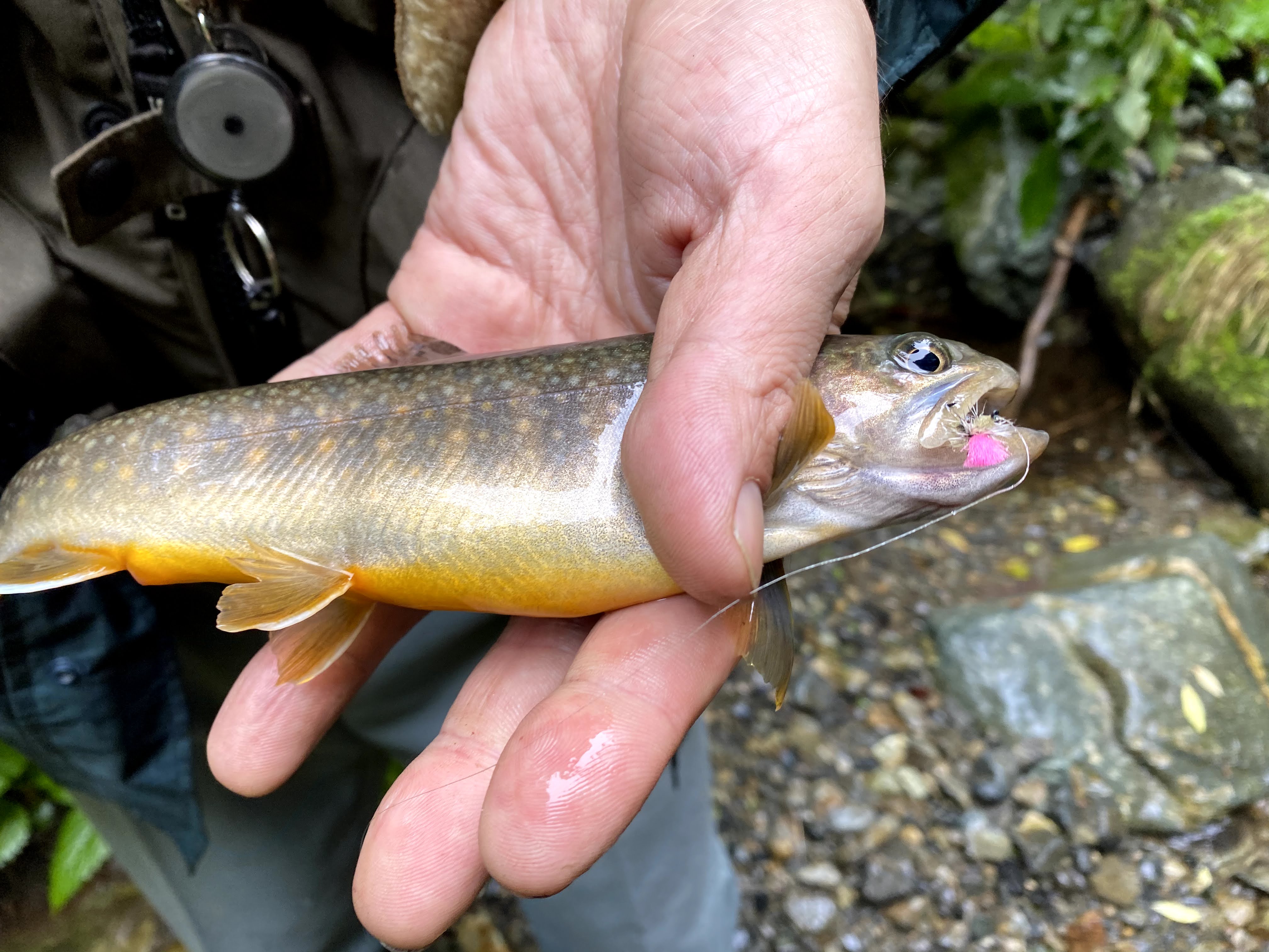 ラインをたぐり寄せて手に取ると、大きさ22cm程の綺麗な岩魚。