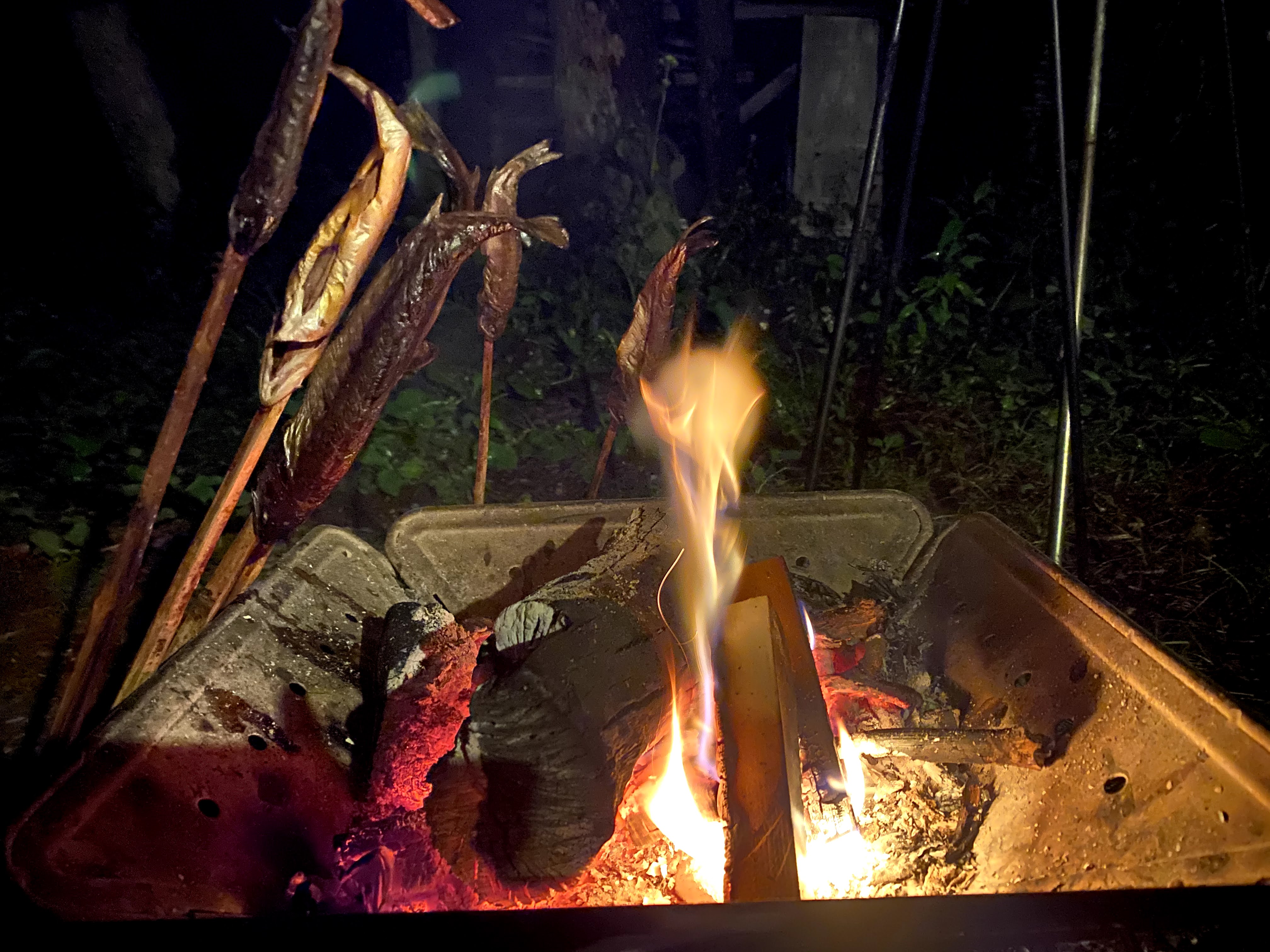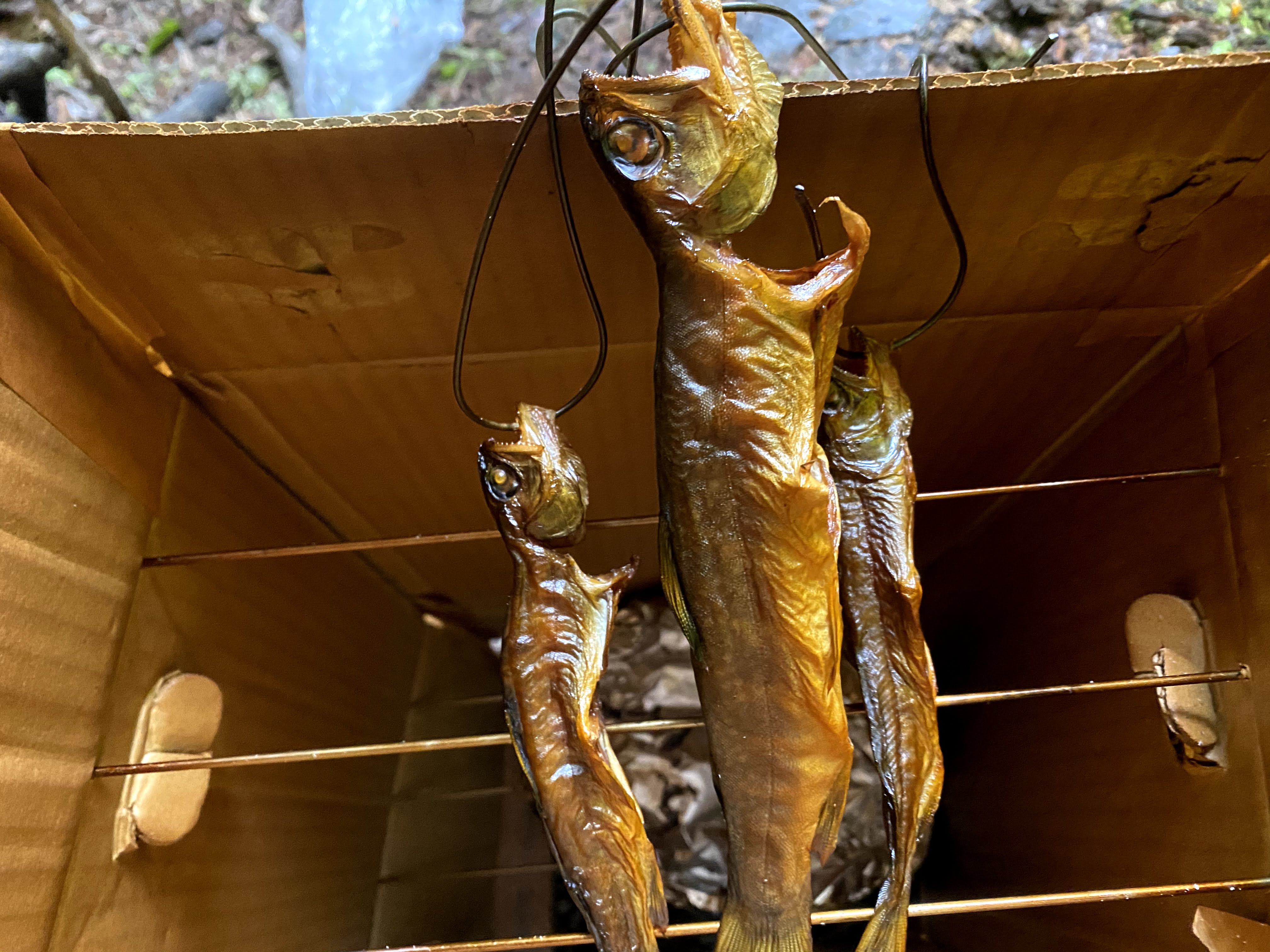 キャンプ場に戻ると、スモーカーから出ていた煙もおさまって、岩魚の燻製も無事完成しておりました。