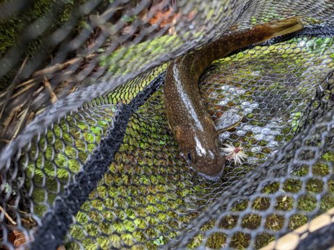 その後は反応が渋くなりましたが、1時間程遡行すると徐々に魚影が多くなり、ゼンマイ胴伝承系毛鉤に岩魚が出てくれるようになりました。
