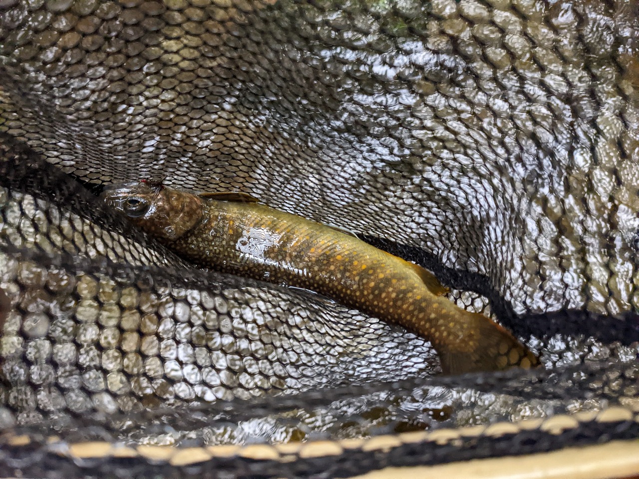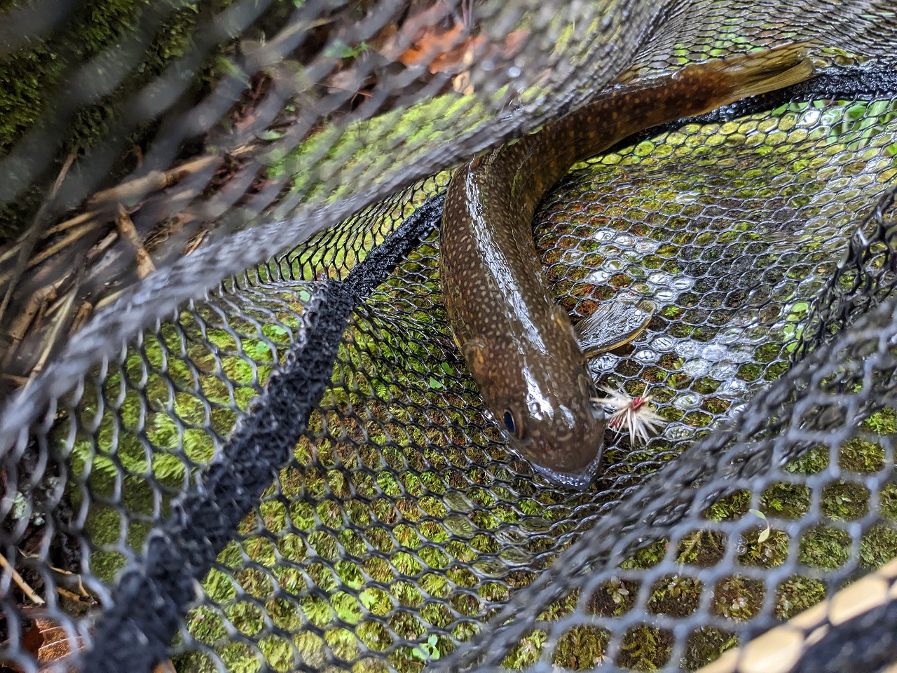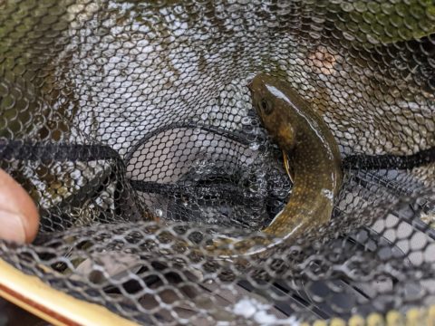 入って程なく1匹目が毛鉤に出てくれました。サイズはそれほどではありませんが、きれいな魚体の岩魚です。