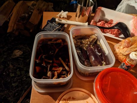 芋煮の他には、つまみにナスの中華風レンチンびたしに、ワラビとオシロイシメジの醤油漬け、豚バラの焼肉。