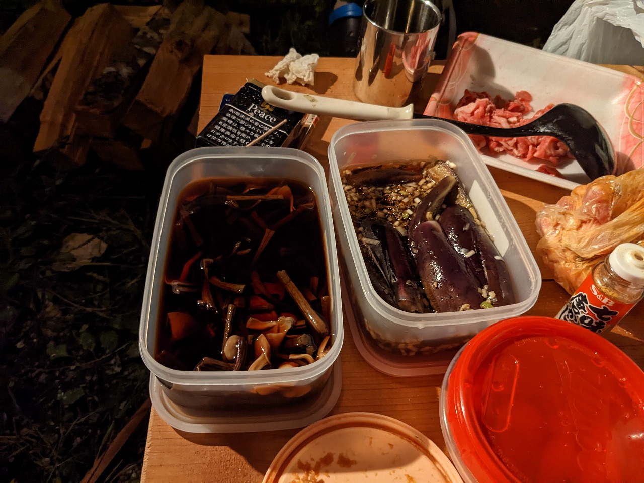 本当はメインの芋煮に入れるのが定番なのだが、スージーにキノコ抜きを約束してしまったので…それともう一品は、家から持ってきた大量のナスを、中華風の焼き浸しならぬレンチン浸しに。