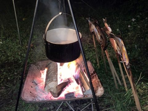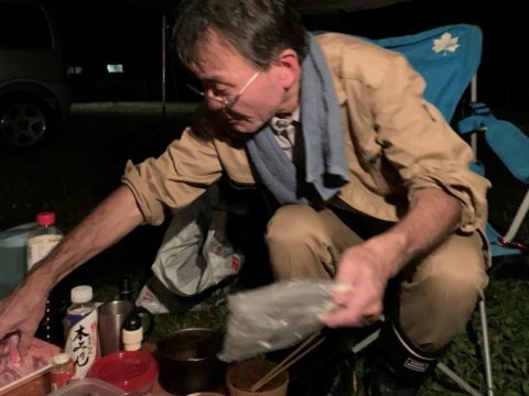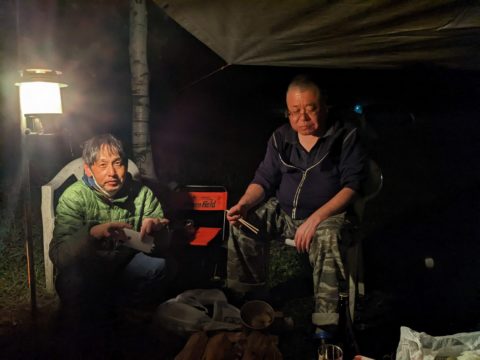 秋なので、晩のメニューは秋の定番野外料理の芋煮。外は若干霧雨っぽい物が舞っているので、キャンプ場の隅っこにシルバーシートタープを張って、その下で宴会スタートです。