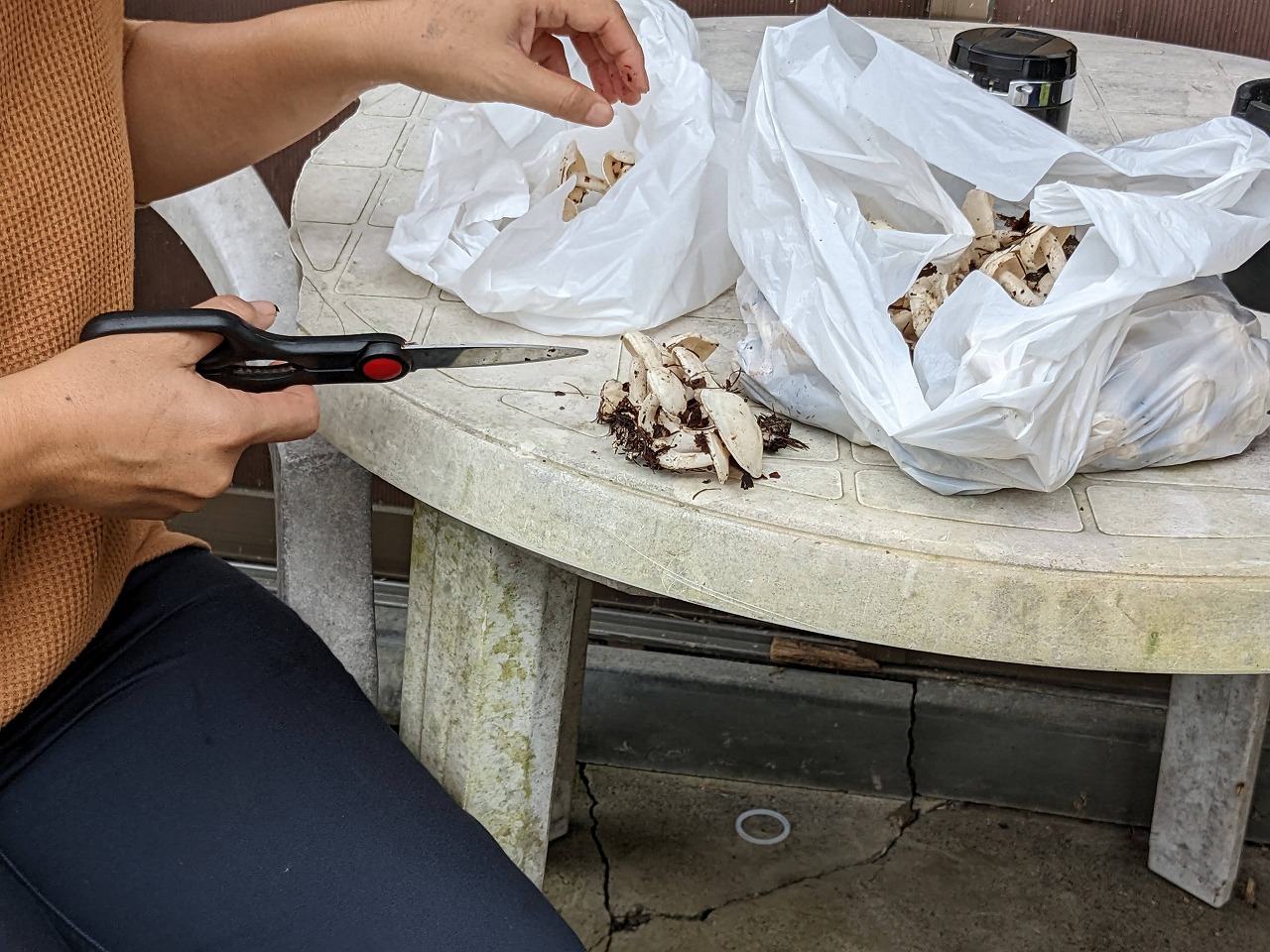 N夫人に、「石突を切り落としたら、落ち葉をさっと払って、湯がいて水にさらしながら、ゴミを綺麗に取り除くんだよ」「ゆがけば、キノコは崩れなくなるから…」と教えました。